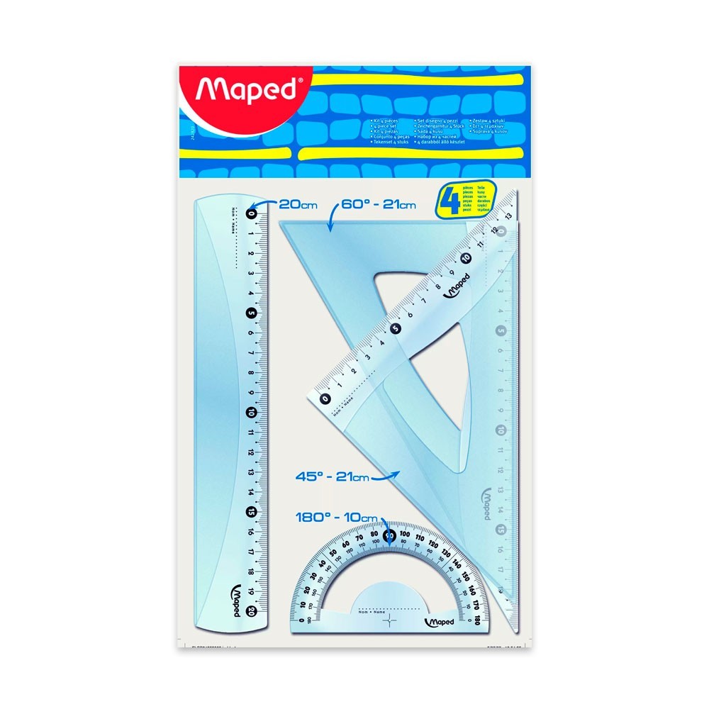 Juego de geometría que contiene 1 regla de 20 cm, 1 escuadra de 60º de 21 cm, 1 escuadra de 45º de 21 cm y 1 semi-círculo de 180º de 10 cm.