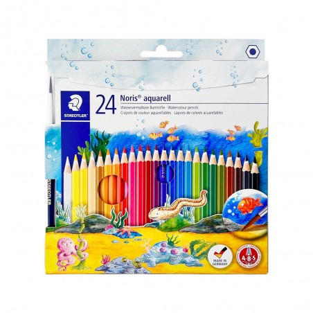 Caja de cartón contiene 24 colores surtidos + pincel.