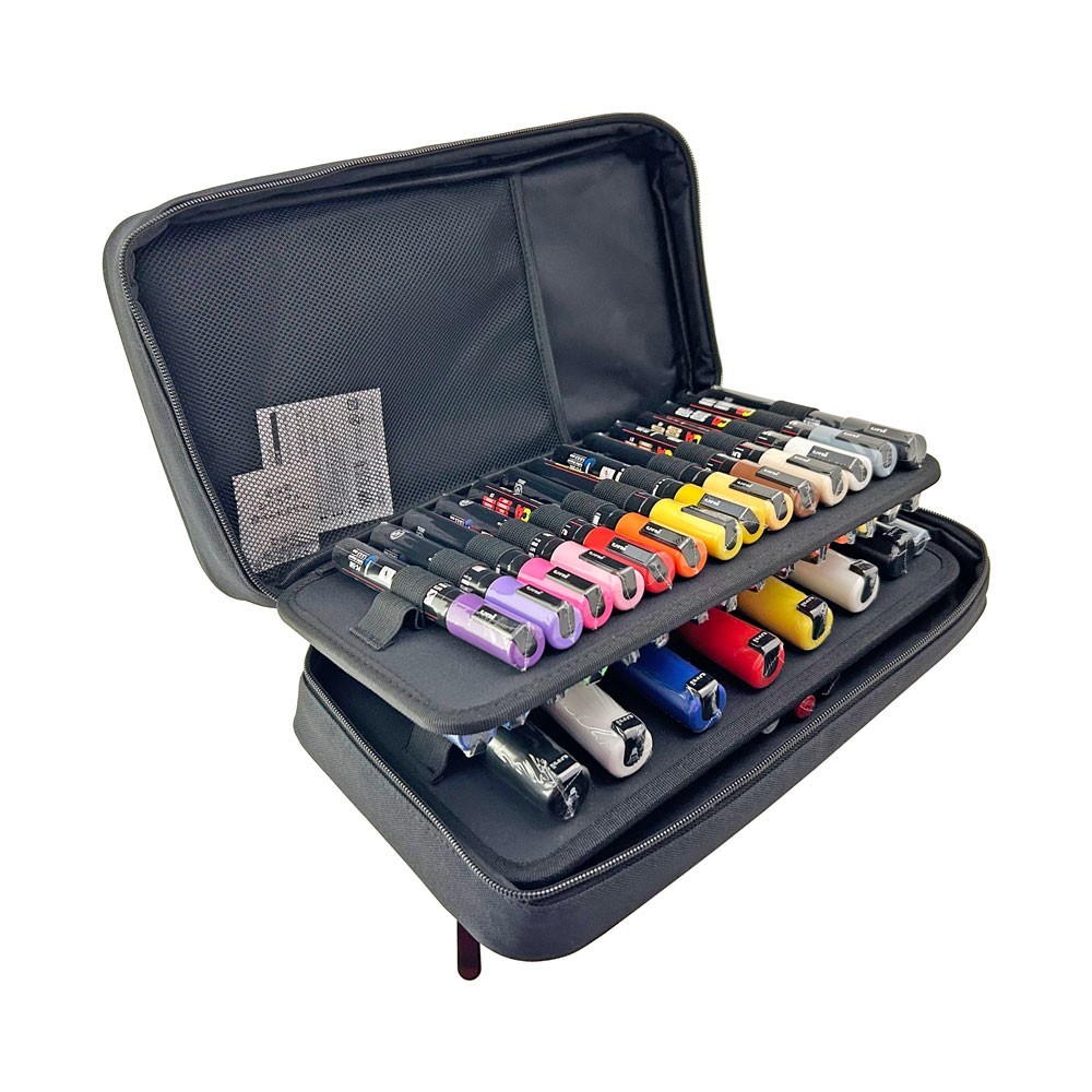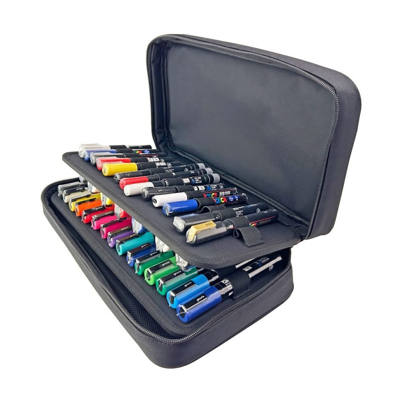 Contiene 50 marcadores, gran variedad de trazos y colores. ¡ Estuche de regalo! El estuche tiene la capacidad de almacenar hasta 60 marcadores, cuenta con 4 pisos y 15 elásticos individuales en cada piso. Además incluye un sobre en su interior y bolsillo en el exterior.